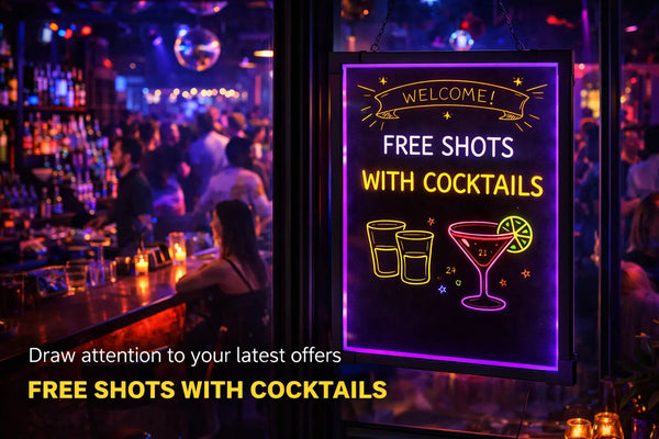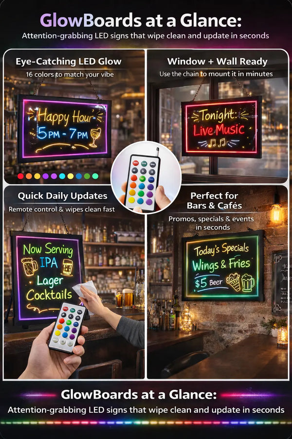 GlowBoards is built for busy bars and cafés that need to change announcements fast. Write your message, pick your glow color, place it in your business, and you’re done. It’s bright, easy to read, and easy to wipe clean, so you can update happy hour, events, and daily offers without the hassle.